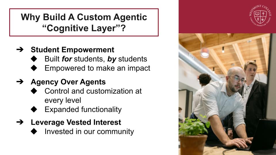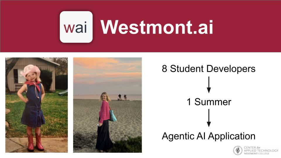 The session highlighted work from Westmont College’s Center for Applied Technology (CATLab). Slides outlined students’ needs for technical training and experience alongside institutional needs for technological infrastructure. The presentation then introduced a conversational UI proof of concept and the launch of Westmont.ai, an agentic AI platform developed by students.